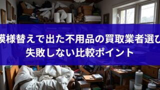 アイテム 模様替えで出た不用品の買取業者選び|失敗しない比較ポイント 模様替えで出る家具や家電を買取に出すなら業者選びが重要です。失敗しないための比較ポイントをわかりやすく解説します。 2025.09.27 アイテム